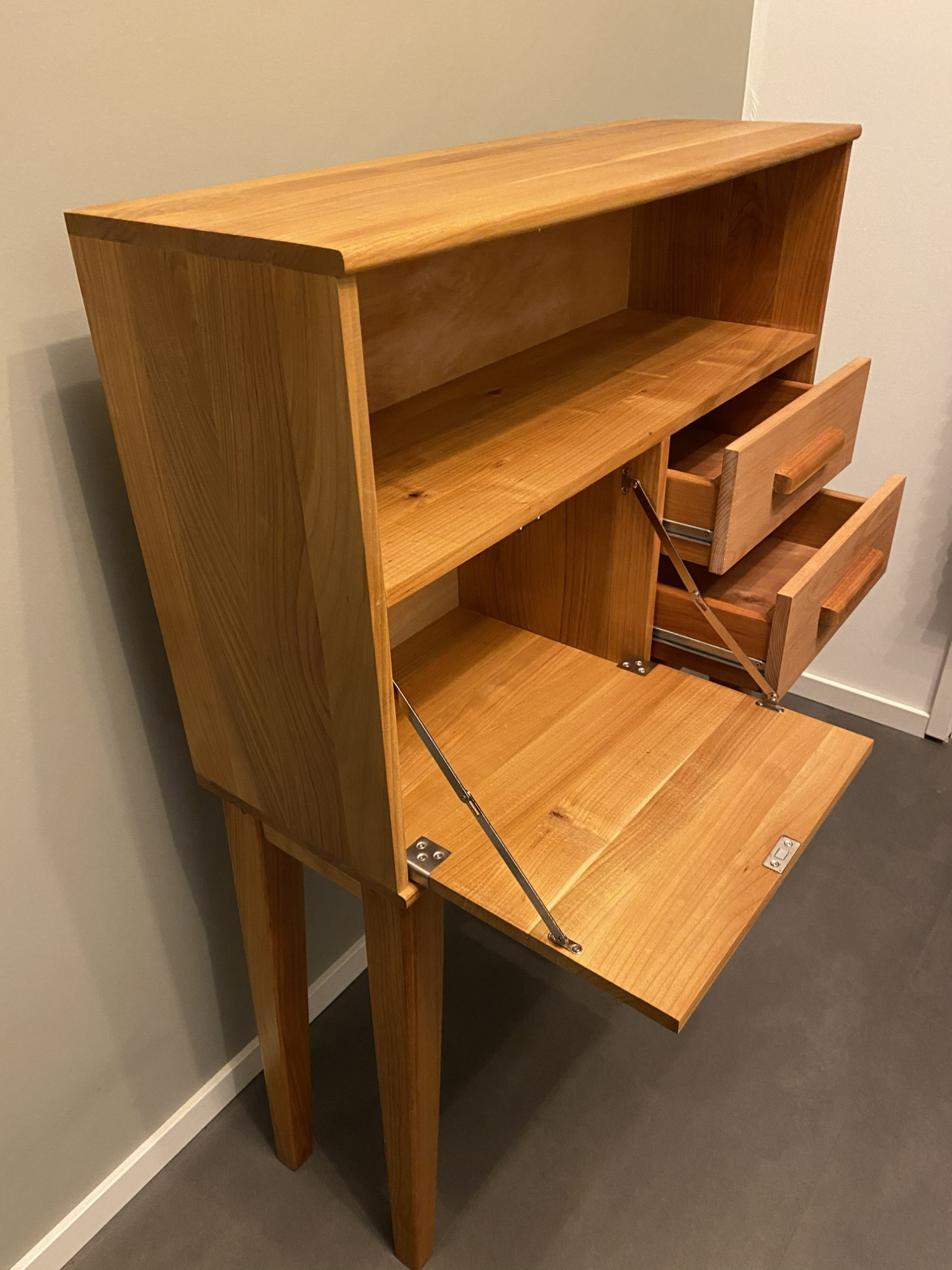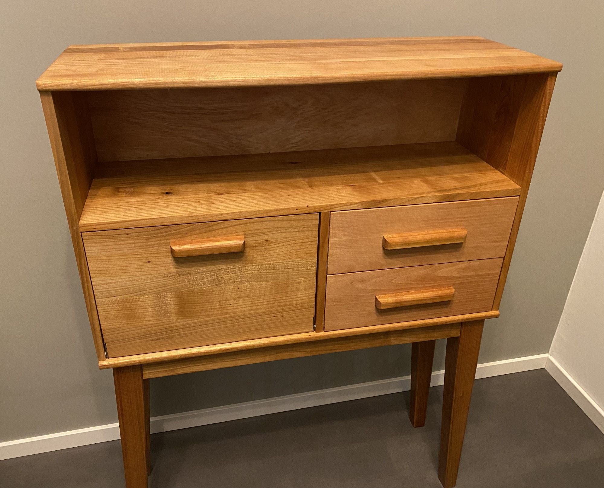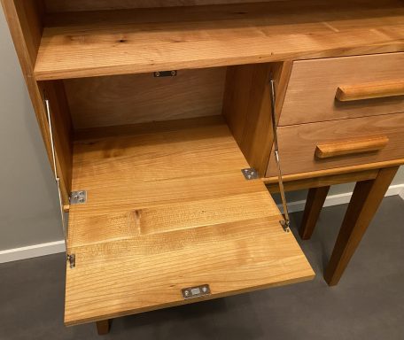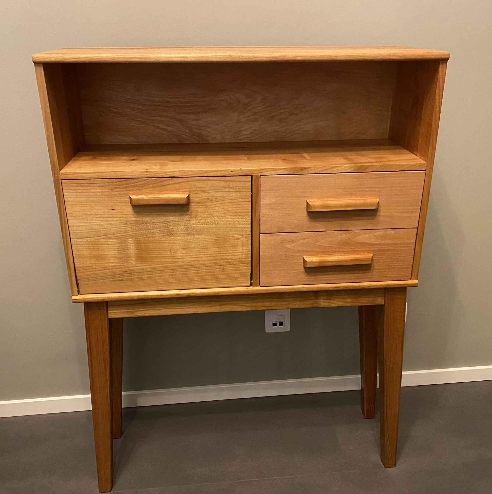Nieuw gemaakt vintage buffetkastje of klein dressoir. Mooie klassieke stijl, met een open vak, een klep en twee lades. Massief kersenhout afgewerkt met een transparante meubelolie.