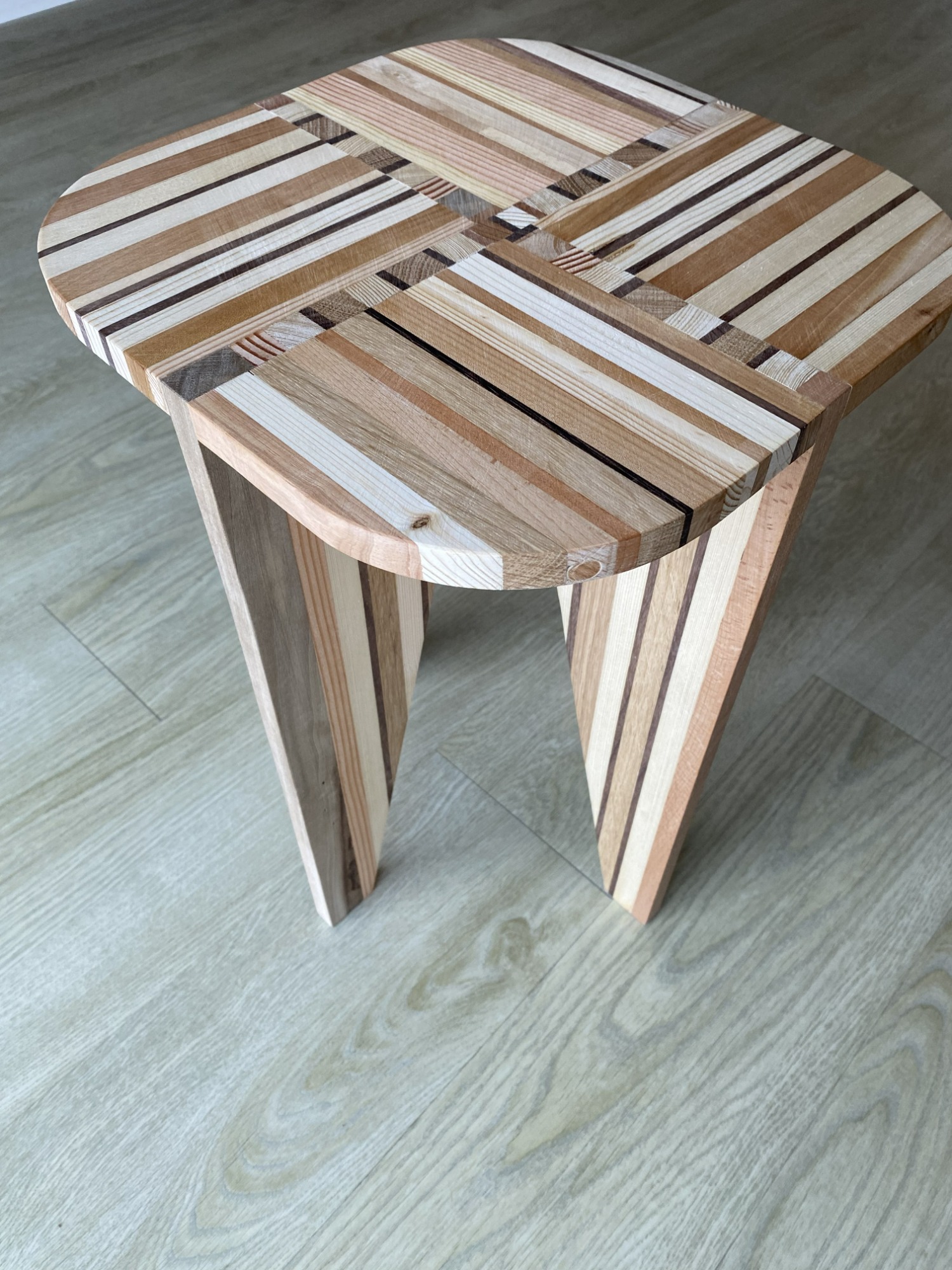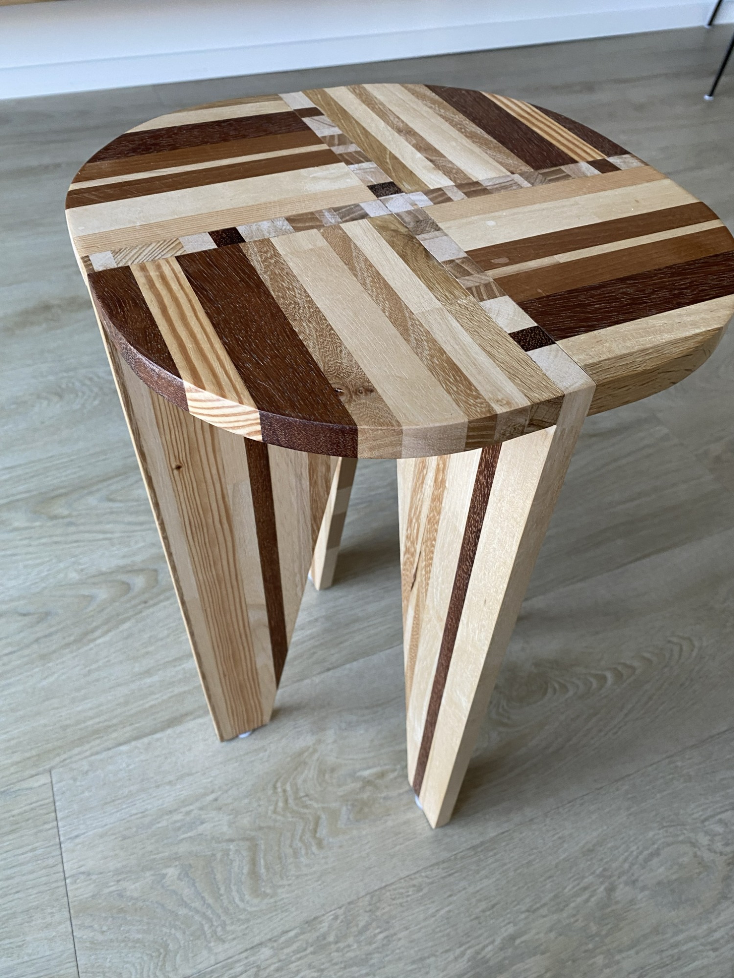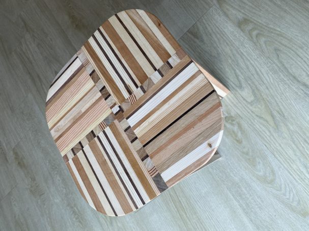 Twee unieke bijzettafels/krukjes. Gemaakt van massief houten balkjes, in verschillende kleuren/houtsoorten. Afgewerkt met een neutrale meubelolie. De grote is 50 hoog en diameter blad van 35 cm. Prijs van de grote kruks is 45 euro. De kleinere is 48cm hoog en 31 cm diameter. De prijs van de kleine kruk is 35 euro. Samen als set 10% korting. De kleine past net deels onder de grote.