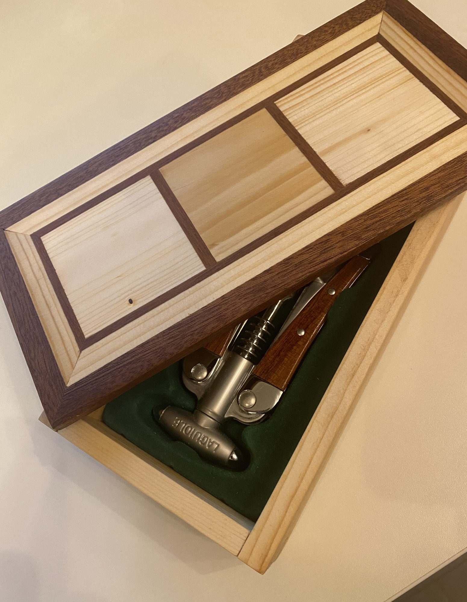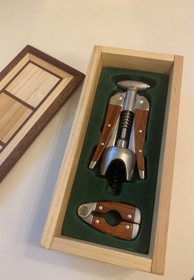 Luxe kurkentrekker set in mooi handgemaakt houten kistje. Met klassieke zwaluwstaart verbindingen en houten inleg van meranti hout.