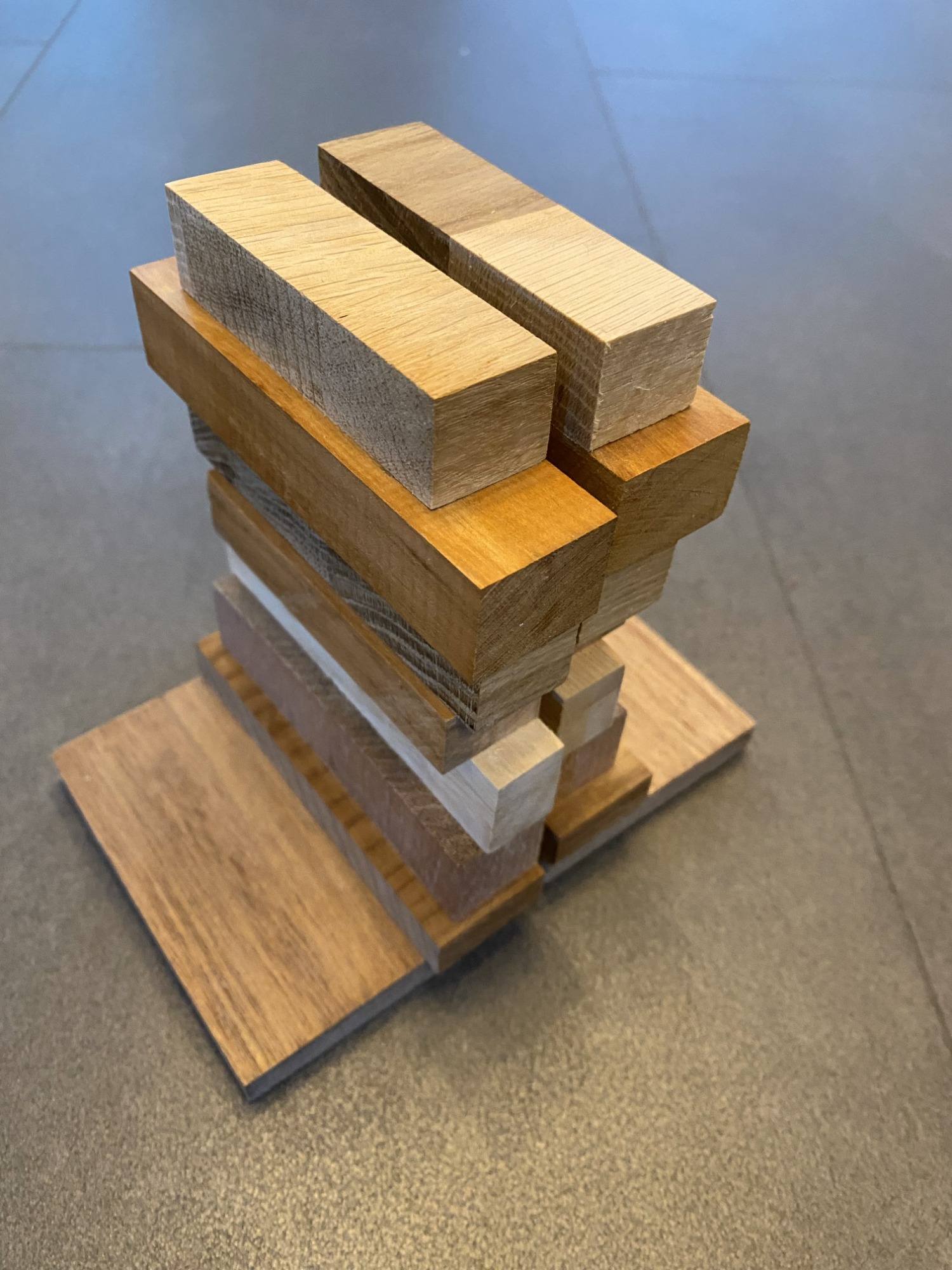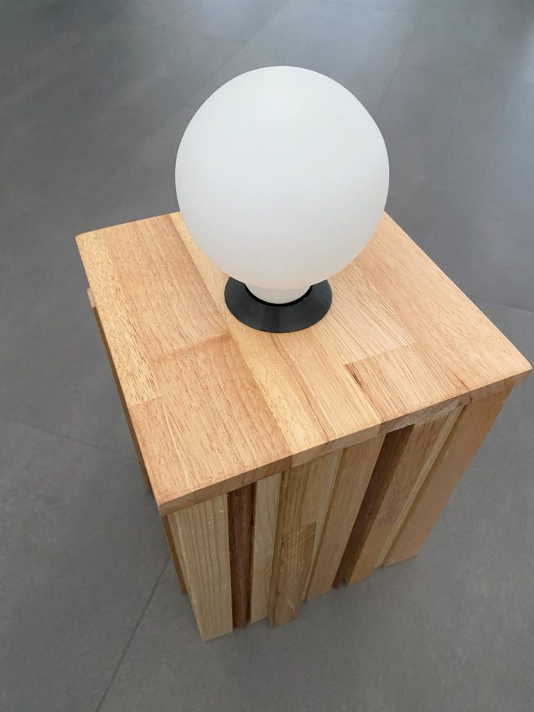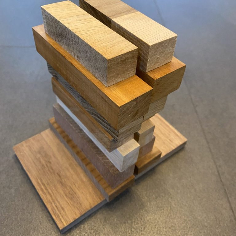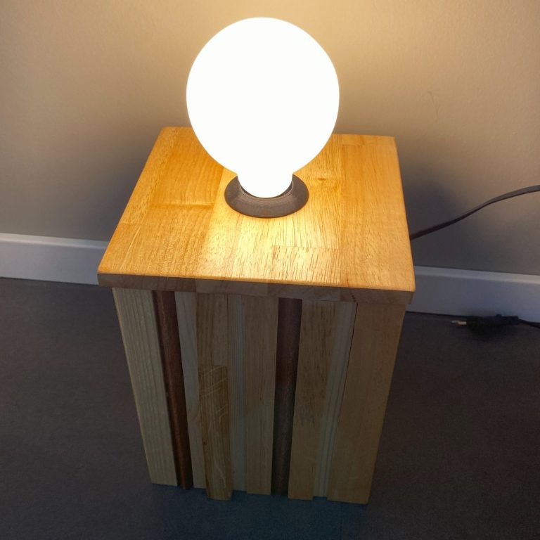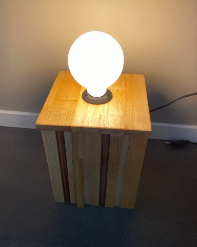 Een robuuste tafellamp. Gemaakt met verschillende stroken hout. Afmeting van de lamp is 18 cm breed, 18 cm diep en 25 cm hoog (zonder de lamp meegemeten).
